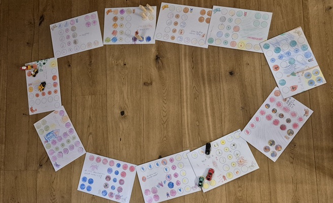 Vorlage ausdrucken auf Format der Wahl (A5/A4/A3…), mit den Teilis farblich gestalten und mit losspielen.
