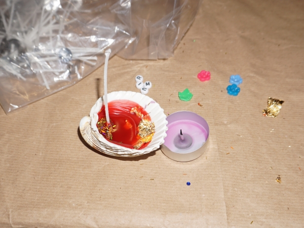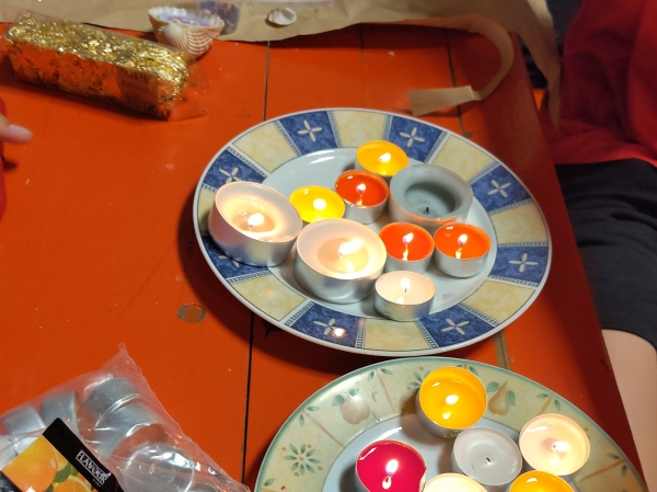 Kesi und Pia haben das deutlich einfacher gemacht. Wenn ein Teelicht eine Weile brennt, schmilzt das Wachs und die Teilis können es einfach in die Muschelschale kippen. Ja, Wachs in größeren Mengen kaufen und schmelzen ist günstiger. Aber diese Methode ist für die Teilis definitiv besser. Sorgt dafür, dass möglichst keine Wachsflecken auf dem Boden, den Tischen und den Kleidern der Teilis entstehen.