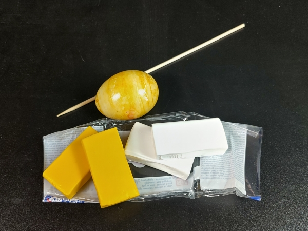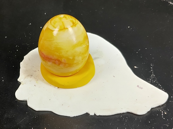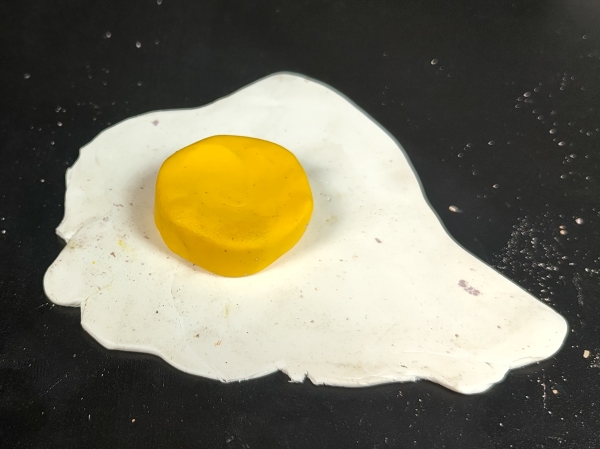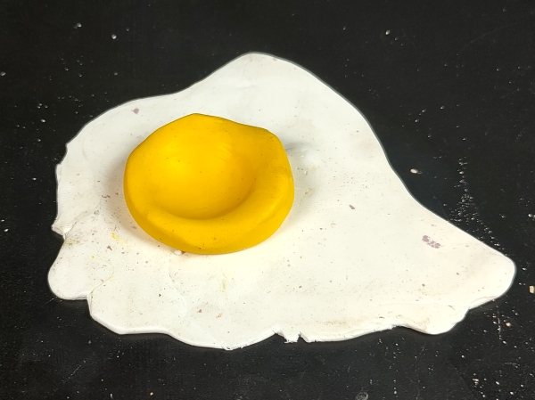 Aus einer viertel Packung der gelben Modelliermasse habe ich einen Dotter geformt. Also zuerst mal eine 1cm dicke, runde Scheibe, die etwa dreieinhalb Zentimeter Durchmesser hat. Die Unterseite der Scheibe und die Stelle auf dem Eiweiß wo sie hin soll habe ich mit einem Schaschlikspieß etwas angekratzt, damit sich die beiden Teile gut verbinden.