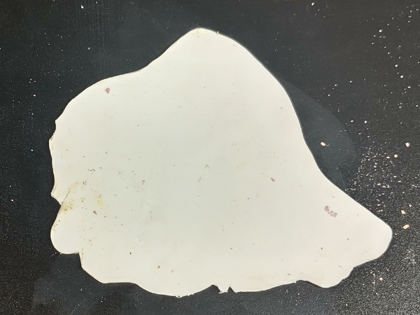 Aus der weißen Modeliermasse formt ihr einen 2mm dünnen, unregelmäßigen „Fladen“. Ich habe eine halbe 57g Packung genommen, das war optimal. Nicht so optimal war, dass ich den Basteltisch nicht vorher abgewischt oder mit Backpapier abgedeckt habe. Da bleibt wohl ein bisschen Schmutz im Spiegelei…